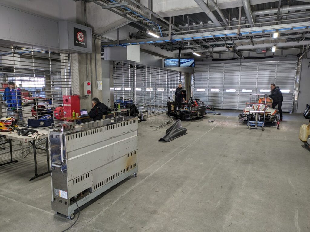 ピットの中は、こんな感じです。結構広いです。これから、我々がのるマシンのメンテナンスをしてくれています。