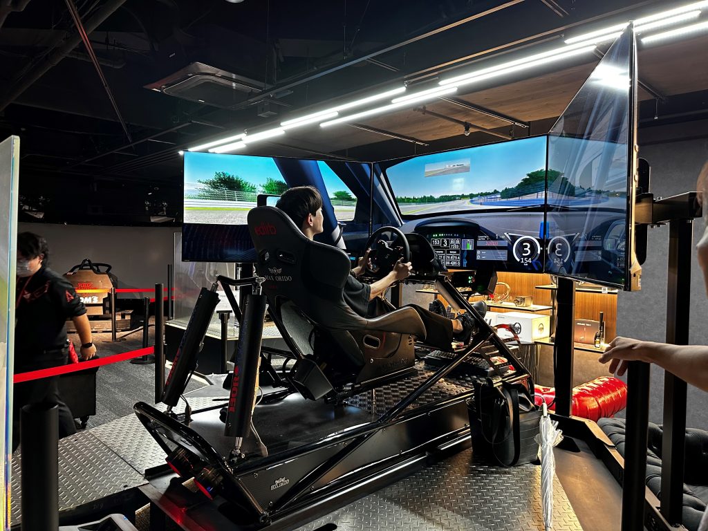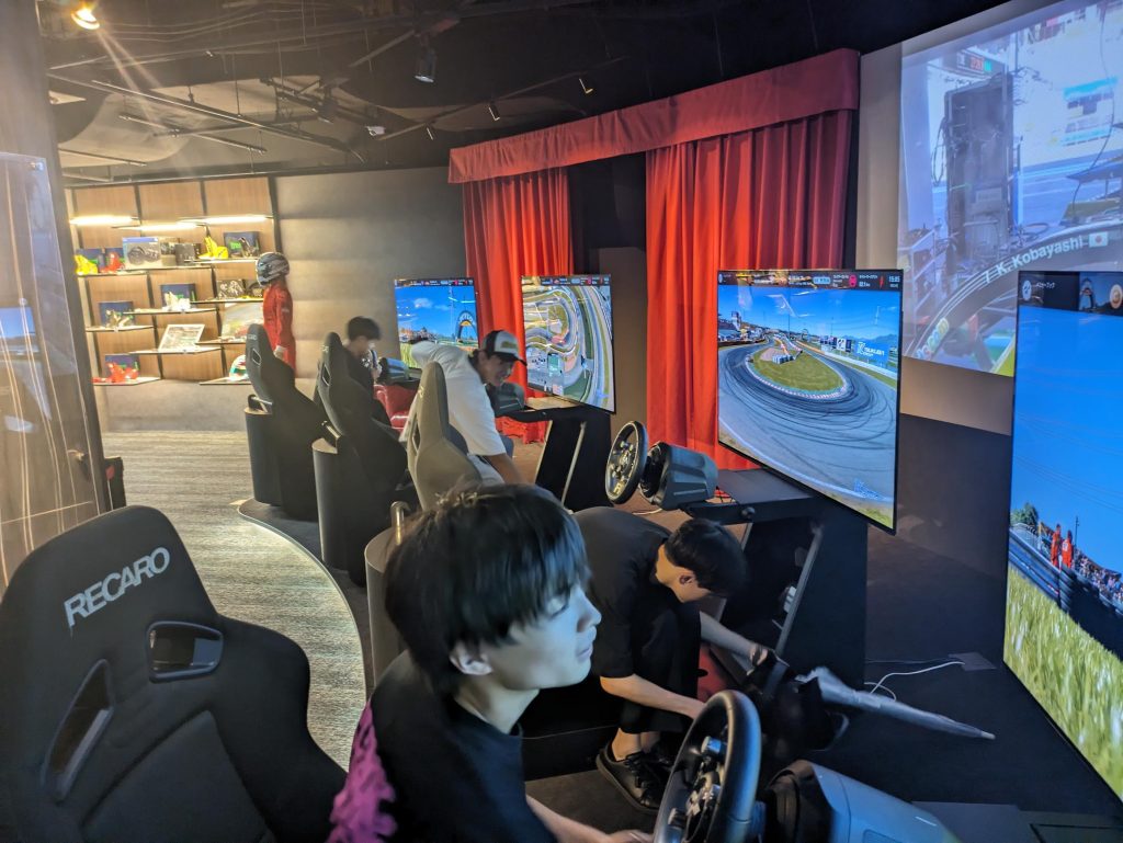 本格的なレーシングシュミレータ(左)、運転するだけでも難しい。みんなでレース(右)