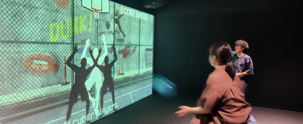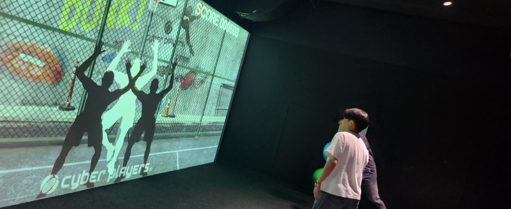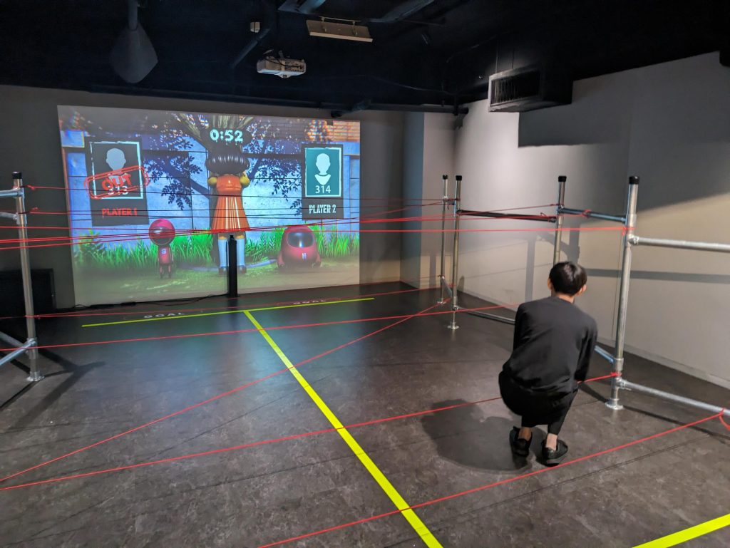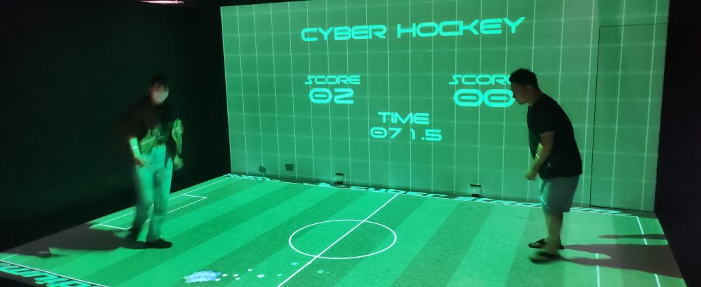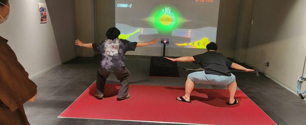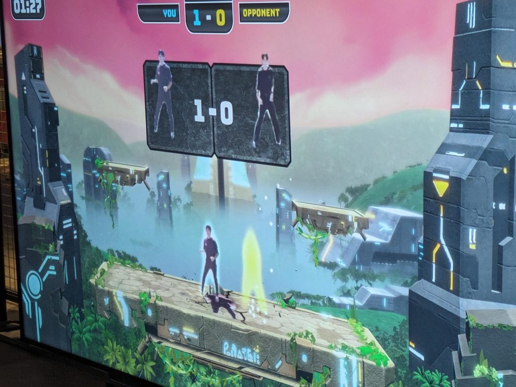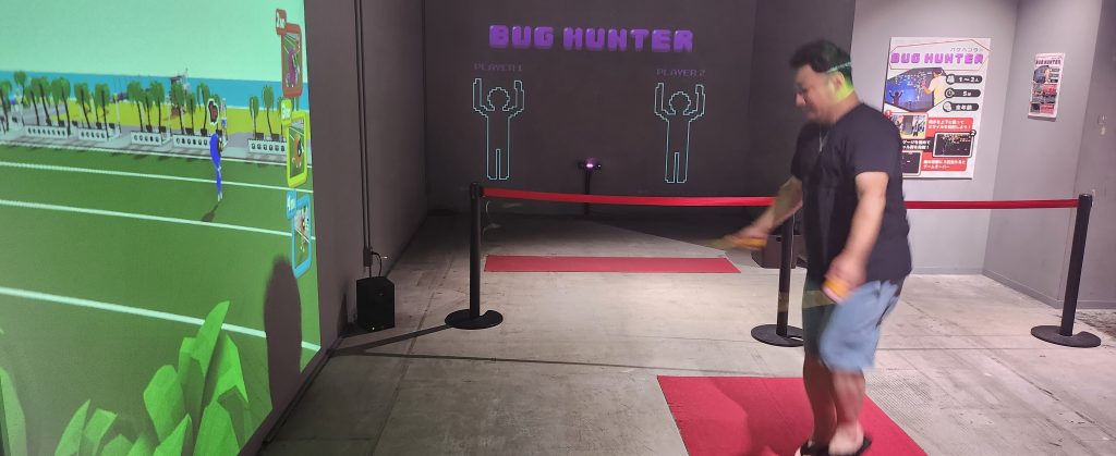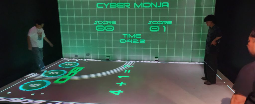 自分が映像に登場し、お互いジャンプしながら画面上の自分を操作し、踏みつけるアトラクション。