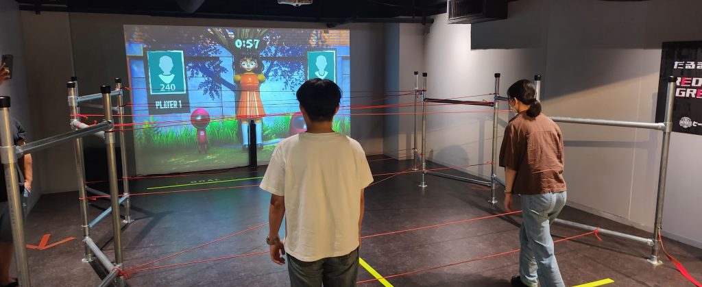 「だるまさんがころんだ」です。紐をよけながら、映像の気持ち悪い女の子に見つからないようにゴールを目指すのですが、これが、難しすぎる。