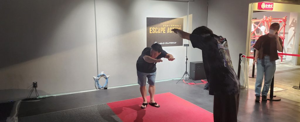 映像に出てくる人のいろんな形をした通りのポーズをとり、障害物を超えていくアトラクション。
